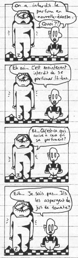 19 On a interdit le parfum en nouvelle-écosse. [vrai] Quoi?! Eh oui... C'est maintenant interdit de se parfumer là-bas. Et... Qu'est-ce qui arrive à ceux qui se parfument? Euh... Je sais pas... Ils les aspergent de jus de tomate? << >>
