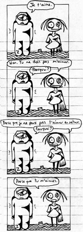 23 Je t'aime. Non, tu ne dois pas m'aimer. [tu ne devrais pas] Pourquoi? Parce que je ne peux pas t'aimer en retour. Pourquoi? Parce que tu m'aimes. << >>