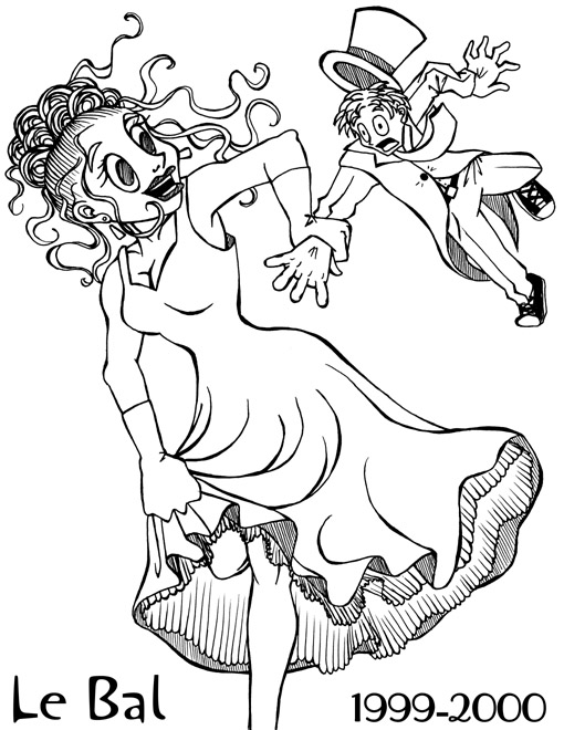 Petite historique: C'est mon dessin qui a gagné pour représenter le billet du bal de cette année. Je me suis surtout inspirée d'un dessin que j'avais déjà vu sur un concours de dessin, illustré par Viviane Haene, mais je tiens vriament à préciser que j'a fait ce dessin sans modèle immédiat. J'en suis plutôt satisfaite. Globablement. Il y a des tonnes de petits trucs qui m'achalent, comme les mains, les plis, etc, mais dans l'ensemble, ça passe.