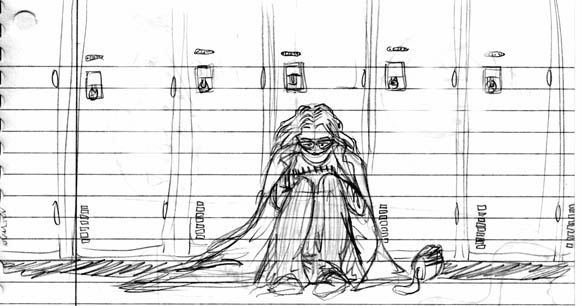 Petite historique: Il fallait bien que j'immortalise ça un peu. À chaque midi, je m'installe devant mon casier pour dessiner. Alors je me suis dessinée en train de me dessiner moi-même en train de me dessiner en train de me dessiner (et ainsi de suite jusqu'à la fin des temps). Cette journée-là, je revenais de dehors, c'est pour ça que j'ai mon manteau. C'est un peu fait à la botche en passant.