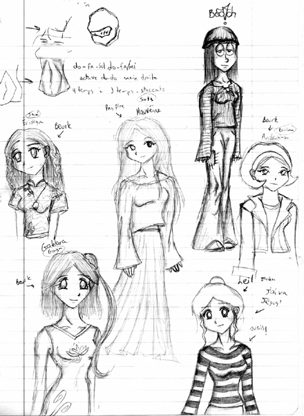 Petite historique: Ce dessin-là, j'aurais dû l'appeler Nostalgie! En effet, ce sont des "remake" de vieux dessins que j'avais fait en secondaire 2 et 3. Il y a d'abord Bootch, en haut à droite (voir dessin original en bas), personnage fétiche à la Jim Davis quand j'étais en sec 2. En fait, c'était ce que j'étais capable de faire de mieux. Je n'avais pas encore découvert le style japonais encore... Les autres filles, c'est-à-dire, de droite à gauche et de haut en bas: Éristique, Mauvéine, Andantina, Gabbra et Leil. Ce sont des personnages inventés par Frédérique et moi... On avait une histoire pour un manga québécois. Les originaux sont en bas de cette page.
