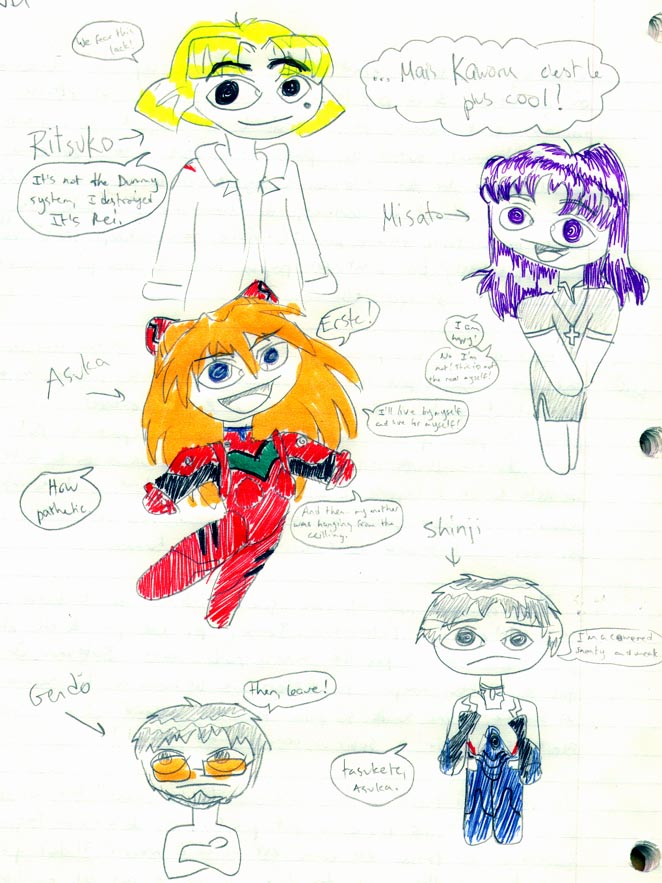 Petite historique: C'est le cours de français... C'est long.... des oraux. J'ai déjà passé ça fait longtemps. Puis me viens une envie folle, que dis-je! une pulsion grandiose qui me prend par derrière: qu'est-ce que je donnerais pour être chez moi présentement et regarder mes cassettes d'eva!! Alors je me suis mis à m'amuser avec mes crayons de couleur....