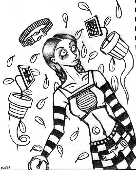 Petite historique: on peut voir, à traversla feuille, quelques mots de vocabulaire de LSQ (langage des signes du québec, pour ceux qui ne savent pas de quoi je parle). J'ai toujours aimé les roulettes à pizza et j'ai récemment découvert un attachement pour les petites strapes en plastiques... ça vient de quandje suis allé à montréal avec Maryse et on a vu des chandails vraiment géniaux qui s'attachaient avec ce genre de strap. Oh, et ce qu'elle a au-desss de la tête, c'est comme une auréole...