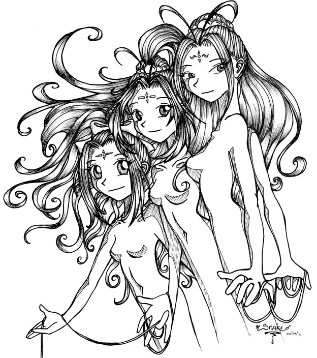 Petite historique: J'ai fait cette 'commission' entre une heure et 3 heures du matin... Les ombres sont illogiques, les mains sont mal faites, en fait, j'avais seulement hâte d'aller me coucher. Les trois eprsonnages en question sont des personnages de Vidandy, une fille très talentueuse de l'attic (le forum). Elle demandais si quelqu'un était intéressé à faire un "art trade". j'ai dit oui. alors j'ai dessiné ses personnages, elle devrait bientôt dessiner les miens. J'ai vraiment hâte de les voir!