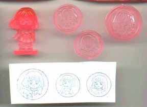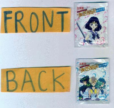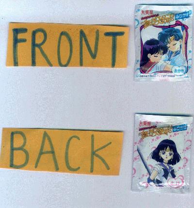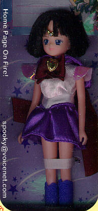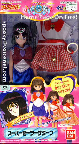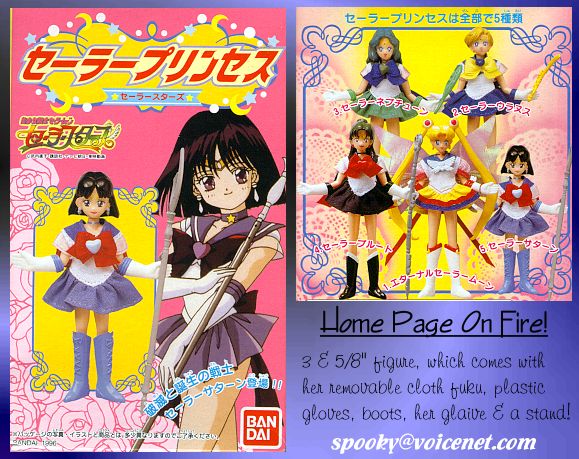 Alisha and Marie's Sailor Moon Shop: They sold some Rice Spice with Sailor Saturn on the cover!($1) And imagine: in their "figure" section, they have put this picture, over! But they don't sell Saturn Garage Kit! Ghh! Bandai : The compagny who make some of the Sailor Moon merchandise... This site is the official site, but it is in japanese House of Anime They sell THE Saturn poster. They also sell a lot of stickers. A LOT! And you can downlaod the image of every sticker sheet. The Ani-Shope : Closed until march 21st Moon Kingdom Products : 1999 calendar (saturn on the cover in a wedding dress) ($9), coloring book ($2,50), Kaori and Prof. Tomoe dolls ($22 and $15) big wallscrolls (they call it banners) of group picture (there's one with saturn) ($18), stickers (various price), keychain (6 for $10), and a briefcase with Saturn on the cover (and Venus, Mars, Neptune, Moon, Chibi Moon and Jupiter, but Saturn is the biggest) ($15). Noix de rome :