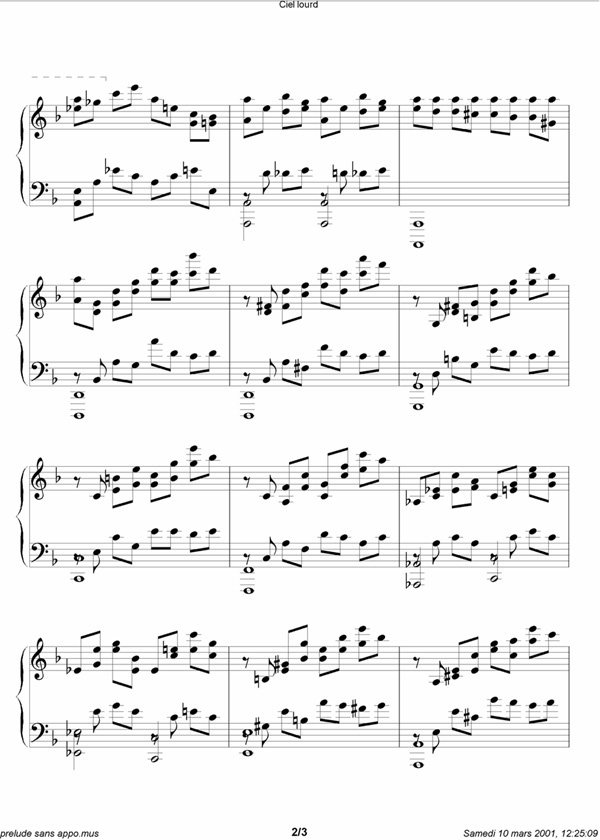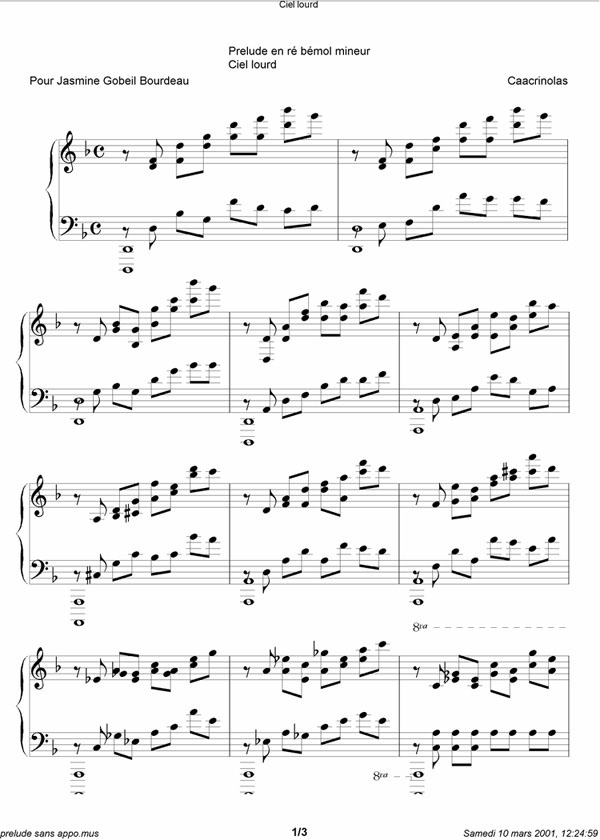 Ton cadeau de fête Si tu es ici sans avoir vu les autres sections de ce petit site, eh bien retourne à la case départ!! Le cadeau, c'est la petite cerise sur le gâteau, et le gâteau c'est un dessert!!! Alors reviens au début, petite vlimeuse!! *** Alors voilà. Tu m'avais souvent dit que tu trouvais inhumain que quelqu'un puisse composer de la musique. Tu me vois venir. Tu pensais que c'était impossible, tu ne comprenais pas comment une telle chose pouvais se faire. Eh bien, j'ai fait l'impossible, juste pour toi!!! ^_^ J'ai composé un petit prélude pour le piano, et j'ai décidé de te le dédicacer! Ça, ça veut dire que si un jour je suis célèbre, eh bien tu le seras aussi! Ton nom apparaîtra quand on parleras de ma première composition entière écrite! (ben dans le fond, c'est ma deuxième terminée écrite... mais l'autre c'est une petite étude poche, alors ça compte pas!). C'est un prélude, il a été construit suivant plus ou moins les mêmes patterns que la Sonate à la lune de Beethoven (le premier mouvement). Il sonne un peu asiatique; c'était pas voulu au départ, mais c'est chouette quand même. Il est en ré mineur, une tonalité avec une armure pas vraiment difficile (il n'y a qu'un bémol), comme ça, tu pourras le jouer un jour! Ça sonne tragique un peu, tragique et lourd, c'est pour ça que je l'ai intitulé "Ciel lourd", tu pourras bien voir pourquoi quand tu vas l'entendre! Non, je n'ai pas d'enregistrement de moi-même qui la joue. Premièrement, parce que je dois d'abord l'apprendre par coeur (même si je l'ai composé, c'est pas spontané du tout, il faudrait que je l'aprenne comme une pièce ordinaire) et deuxièmement parce que de toute façon, je n'ai aucun moyen d'enregistrer le piano et d'en faire un mp3 ensuite pour le mettre sur ce site. Par contre, pour te donner une idée, j'ai un mp3 fait à partir de mon petit logiciel de partition midi (ça sonne un peu mieux que du midi, quand même) mais... c'est pas vraiment représentatif... il n'y a pas d'hésitations, pas de nuances, pas de crescendos, pas de sons forts ni faibles, c'est toujours égal et ça suit le rythme d'un métronome (quand normalement ça devrait pas). Mais je le mets quand même pour te donner une petite idée. Mais garde bien en tête que ça sonne un peu comme si un four micro-onde récitait un poème de Beaudelaire... Prélude