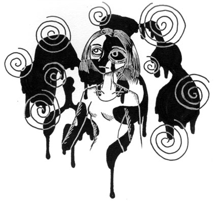 Petite historique: Uzumaki, c'est spirale en japonais. j'ai vu un film qui portait ce nom à Fantasia cette année. Il était... hum... particulier. Ahem! Enfin, depuis ce film, j'adore les spirales! Et puis c'était l'occasion de tester mon nouveau crayon à gel blanc.