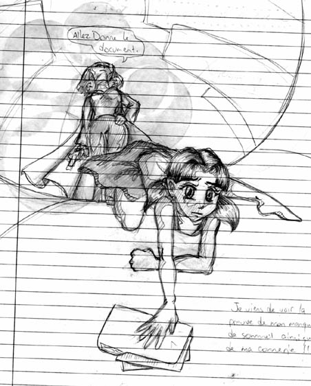 Petite historique: Bah, c'est pas génial, mais enfin... bouah... C'est que j'ai essayé de jouer avec de la perspective de lentille, mais vu que je n'y conais rien mais absolument rien, ça fait pas mal bizarre. Et on peut voir qu'à l'endos de la feuille j'avais fait un gros dessin avec mon compas.