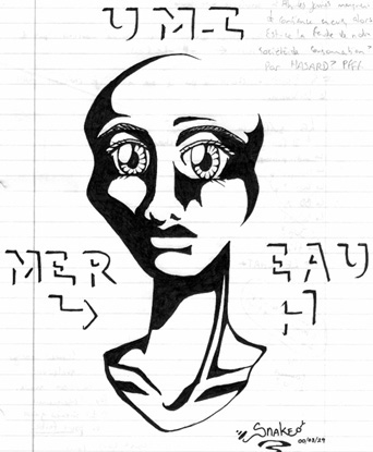 Petite historique: J'ai dessiné ça pendant un cours de religion où nous assistions à la conférence d'un pantecôstiste. Une secte. Et puis euh... le dessin n'a pas vraiment rapport avec ce que le bonhomme disait, mais c'est chouette quand même. Le bonhomme nous râlait qui avait subit le baptême, et qu'il pouvait parler en langues, en glossolalie entre autre (l'autre, je ne m'en rappelle plus). Vive le parle ren langue. j'ai rarement vu quelqu'un d'aussi naïf et croire autant à ses convictions religieuses. Non c'est pas vrai. J'ai déjà vu bien pire. Enfin, pourquoi mer, eau et umi? Eh bien umi signifie "eau" en japonais, et je voulais mettre des mots de trois lettres. Donc, ça n'a pratiquement aucun rapport avec le dessin.