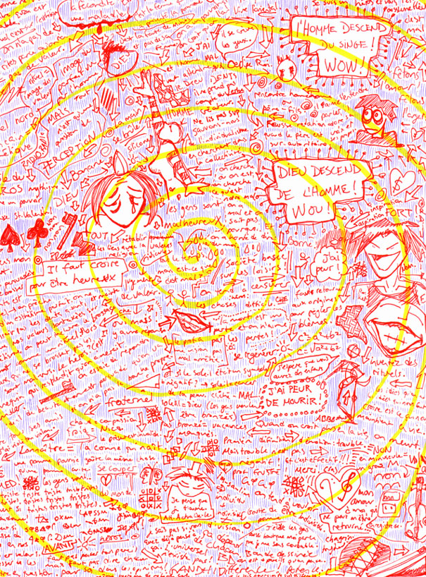 Petite historique: Cours de langue et de Philo (mes cours de philo sont inspirants pour barbouiller des pages entières..). Il y avait une fille à côté de moi qui lisait ce que j'écrivais et qui m'observait dessiner. Je n'aime pas ça. Une chance que je suis gaucher, j'étais assis à sa droite, alors je pouvais cacher la tablette avec mon bras.