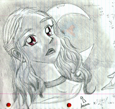 Petite historique: Non, c'est pas vraiment Ariane, mais ce sont ses cheveux! Dessin pendant le cours d'anglais. J'ai essayé un petit effet de contre-jour... meilleure chance la prochaine fois. Date du dessin: 3 février 2000.