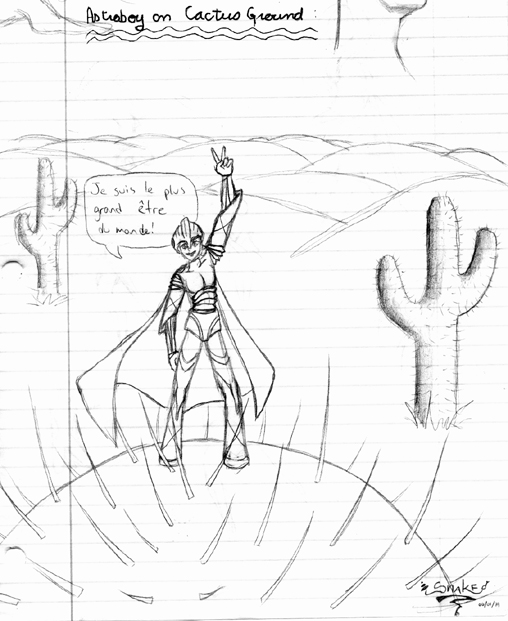 Petite historique: Caro m'a donné un titre. C'était "Astroboy on a cactus ground". J'étais supposée faire un dessin avec ce thème. Voilà. Voilà un bonhomme robot qui se dit être "le plus grand être du monde" car il se croit puissant avec sa grosse armure, mais il se tient un un cactus dans un désert, il ne se rend donc pas compte qu'il n'est en fait pas grand chose...