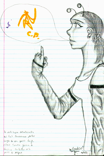 Petite historique: Titre: La ventriloque extraterrestre qui fait citer l'ongle de son petit doigt l'oeuvre géniale de Christine Bouthillier fait au marqueur orange ainsi que le point du serpent.