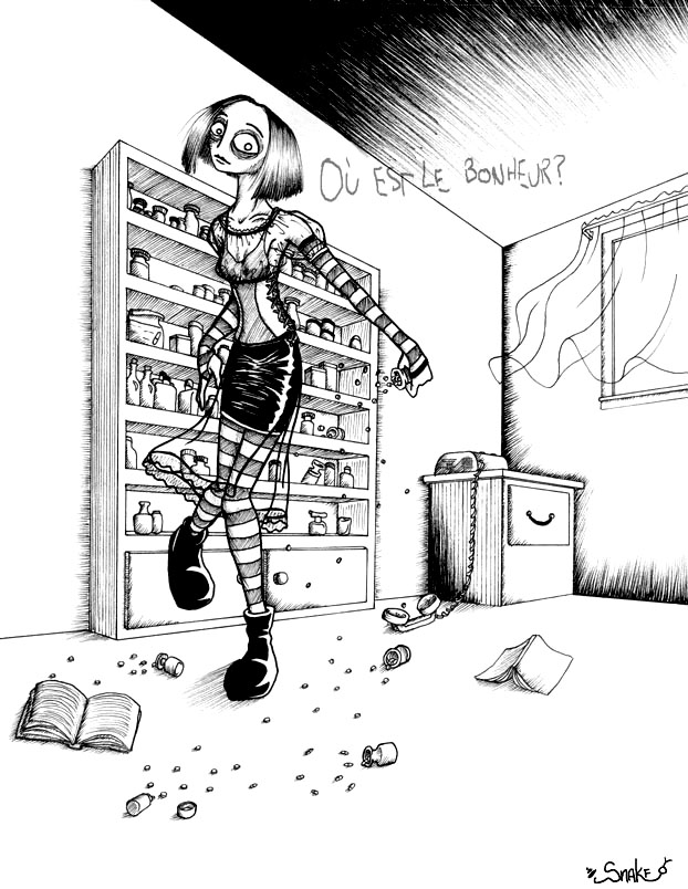 Petite historique: C'est probablement mon dessin préféré de tous les temps... J'ai exploré la perspective avec deux points de fuite et puis il y a un bibliothèque à pilules! Soit, le dessin n'est pas parfait, mais il est à mon goût. Et puis... il n'est pas vide de sens comme d'habitude.
