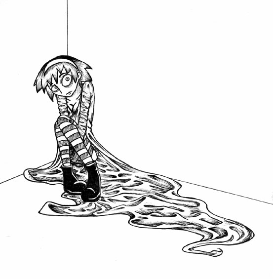 Petite historique: Il est 22h30, j'ai rien à faire, je garde mes petits coinsins et ils sont couchés. J'ai promis à Ariane un dessin. Elle est partie travailler à son camp à St-Jovite. Il faut que je lui envoie par la poste. Il faur aussi que je lui envoie un mot qui lui dit qu'il me faut une autorisation écrite de sa main pour pouvoir aller chercher son horaire à sa place. Donc, j'ai pas le choix, il faut que je lui fasse un dessin. J'ai griffoné une tête à la mine et le reste est venu tout seul. Ensuite j'ai encré, mais j'ai tout saloppé le drappé. Tant pis. J'espère qu'elle sera contente.
