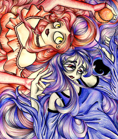 Petite historique: j'ai dessiné ça au salon de thé, c'est là que j'ai rencontré un type qui connaissais quelqu'un suceptible de m'exposer... j'ai colorié tout ça dans la demi-pénomre du salon de thé, à l'arrière, je suis fière d'avoir pu distinguer si bien les couleurs (je me suis rneue comte après que j'avais mis du vert dans le cheveux de la bleue, et que je croyais avoir colorié pas mal de cheveux en jaunes... mais c'était rose/couleur-peau!!! J'ai dessiné aussi deux pièces de vêtement que je venais d'acquérir. Ya un espèce d'effet yin et yan aussi, avec la pêche et le trou noir... mais ça, c'est pas nécessaire de s'en rendre compte... >_<