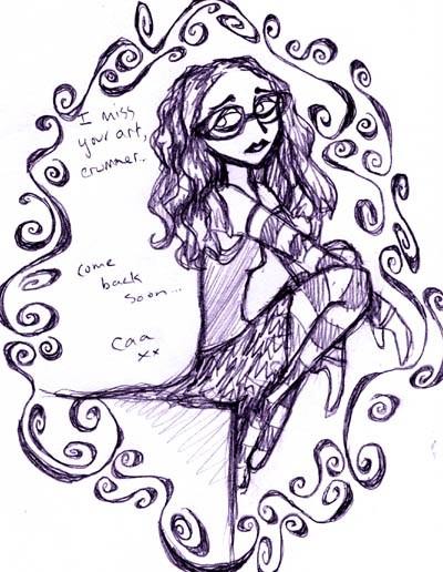 Petite historique: Vous m'avez reconnu, hein? Ben c'est moi! C'est qu'un type qui s'appelle Crummer est parti du forum (l'attic) où on se montre nos dessin. Moi je le trouve vraiment génial, c'est un appenti-L0cke, il a vraiment du potentiel le mec, et j'étais vraiment bien triste qu'il parte, alors j'ai decidé de le faire changer d'idée! Alors je lui ai envoyé deux trucs pour le supplier de revenir...