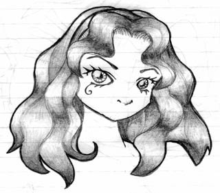 Petite historique: Je l'ai d'abord dessinée sur mon bureau de français, puis ensuite, je me suis dit: eh, c'est pas pire, je vais la dessiner sdans mon pi. Alors je l'ai dessinée dans mon pi. Et ensuite, je l'ai dessinée sur mon bureau d'économie en guise d'offrande à Michel, mon tout premier fan... Elle a le petit signe en dessous de l'oeil de 'death' tirée du marchand de sable je crois, en tout cas, une BD assez sombre américaine qu'Audrey a eu le bonheur de me présenter. Et comme vue d'ensemble, je trouvais qu'elle avait les mêmes cheveux que Michiru. Alors je l'ai appelée Michiru. (pas très originale la fille)