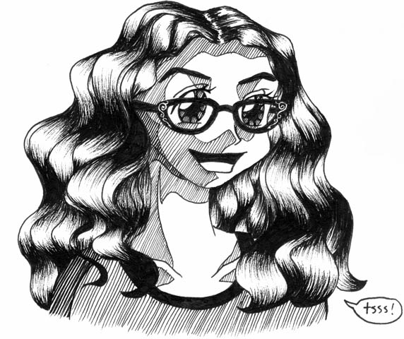 Petite historique: le Tsss, c'est parce que c'est le bruit du serpent, là! -_-;; Voci l'essai numéro 2, beaucoup détaillé et moins stylisé que le premier. 'dessinez-vous en personnage d'animé'. J'aime bien les reflets surles cheveux, mais ils ne sont pas au bon endroit sur la partie de droite du dessin. Je suis particulièrement satisfaite des lunettes. Diantre, c'est vraiment dur!!! J'avais mes lunettes devant moi, et j'essayais de les reproduire, c'est vraiment un défi de taille. Mon frère m'a dit que ça me ressemblais. Chouette. alors c'est peut-être mon tout premier auto-portrait qui a de l'allure.