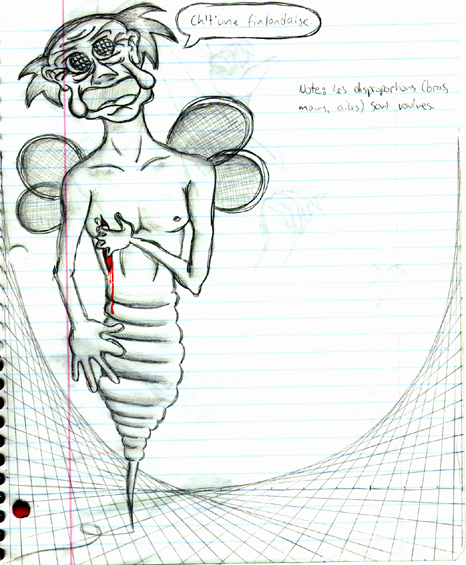 Petite historique: Ch't'une finlandaise! C'est que Sébastien n'arrête plus maintenant de m'appeler "La finlandaise". Pourquoi? Parce que un jour, dans mon cours de théâtre, il ne s'était pas apperçu que j'étais là parce que je dessinais ce dessin. Il parlait avec les autres qui il disait que je ressemblais à une échangiste d'un autre pays qui ne parle pas le français. Une finlandaise plus exactement. Parce que j'étais trop concentrée sur mes dessins. Alors j'ai rajouté sur ce dessin un "Ch't'une finlandaise"... Et puis les disproportions sont voulues, en passant.