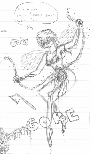 Petite historique: Tiens, la madame elle sort ses trippes! Je m'excuse de ne pas avoir encré ce dessin, ni d'y avoir rajouté de la couleur... Mais ça ne me tentait pas.