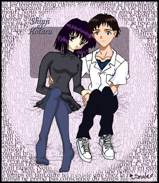 Petite historique: C'était encore pour un concours de dessin. Il fallait matcher une Sailor avec un personnage d'une autre série japonaise. J'ai choisi Hotaru et Shinji parce qu'ils vont si bien ensemble... Note: le texte en arrière (oui, j'aime mettre du texte en arrière de mes dessins, illisible), c'est des bla bla sans sens...