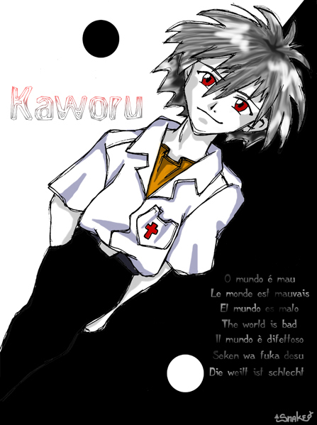 Petite historique: mon premier envoi à M.A.C! (monthly anime character). Il s'agit de Kaworu, mais je crois que c'est faile à deviner. Puis il y a "le monde est mauvais " en plein de langues (vive christian et vive babelfish). Pourquoi? No sé. Puis il y a un backgournd à la "yin et yan" en arrière. j'en ai appris beaucoup en faisant ce dessin... sur les capacités médiocres de Tabris, mon ordinateur. Manque de mémoire.