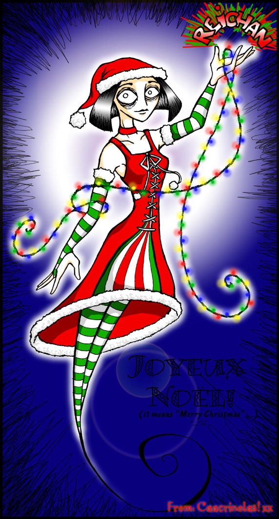 Petite historique: on voulait faire un échange de cadeau à l'attic, mais on s'est dit qu'on était pas vraiment à l'aise pour donner notre adresse... ben moi ça me dérangeait pas vraiment, mais on a trouvé une meilleure idée qui bottait des derrières: on a fait un échange de dessins! Thème: Noël. J'avais eu Reichan, alors je lui ai fait ceci... le problème, c'est que je ne suis vraiment pas satisfaite du dessin, je le trouve franchement laid et mal réalisé. L'original sur papier était bien plus beau. Surtout que ce qu'elle m'a donné en échange était tout bonnement époustouflant!! J'étais gênée un peu...