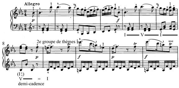 Dans ce mouvement de sonate, le premier groupe de thèmes est clos par une cadence parfaite. L’emploi d’une telle cadence plutôt qu’une demi-cadence est facilement explicable; contrairement à la bonne majorité des sonates, le mouvement est en mineur, et le second groupe de thèmes est d’abord exposé dans le relatif majeur, et non à la dominante. Étant donné que le mouvement ne présente pas de pont modulant, une cadence parfaite s’imposait (à moins de faire le joint entre les deux groupes avec un pivot « V = V9 sur la tierce de I », mais Mozart ne va pas jusqu’à oser une telle chose dans une exposition de sonate – il garde de tels pivots pour les développements).