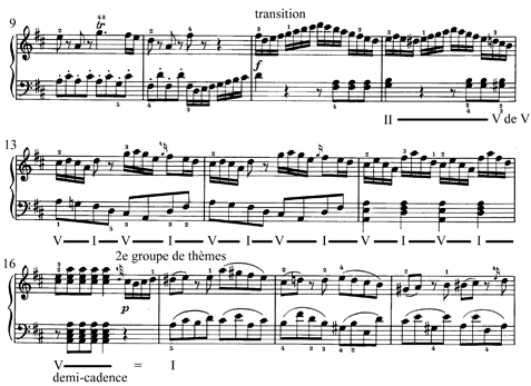 On pourra pardonner à Mozart d’avoir fait changement quant à ses constantes pour ce mouvement de sonate. Une demi-cadence aurait été fort possible dans ce contexte, mais il s’agit ici probablement de l’une des plus belles modulations des sonates pour piano de Mozart, et il aurait été dommage de gâcher la magnifique tierce de picardie (engendrée par un superbe emprunt au mode mineur) qui entame le deuxième groupe de thèmes…