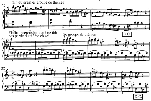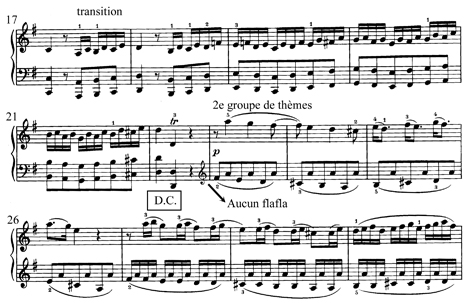 Autre constante, concernant ces demi-cadences : il est de l’habitude de Mozart de débuter le deuxième groupe de thèmes par un petit geste mélodique, parfois très court. Ce petit trait mélodique fait parfois partie du deuxième groupe de thèmes, souvent en anacrouse, parfois il n’est que décoration; par exemple, avec un deuxième groupe de thèmes qui commence par une phrase construite avec un antécédent et un conséquent, le geste mélodique fera partie du thème lorsque celui-ci sera répété dans le conséquent. Autrement, le petit trait mélodique n’est qu’ornemental, comme pour marquer l’arrivée du deuxième groupe de thèmes en caractère gras. Afin d’alléger le texte et d’éviter la confusion, appelons ce petit trait mélodique pré-deuxième-groupe-de-thèmes un « flafla ».