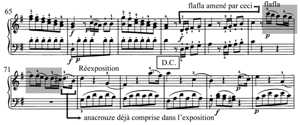 À noter, on retrouve parfois de ces flaflas lorsqu’il y a un changement marqué de section; par exemple, on peut en retrouver à la fin d’une section centrale – mais généralement, ces flaflas en fin de section centrale ne sont pas anacrousiques, et ils arrivent beaucoup moins fréquemment qu’en début de deuxième groupe de thèmes en exposition.