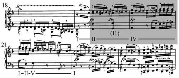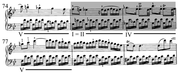 Cet exemple illustre un enchaînement de II à IV (avec un accord de passage) dans un contexte plagal (donc qui ne mène pas à V mais bien à I), dans le deuxième thème du deuxième groupe de thèmes.