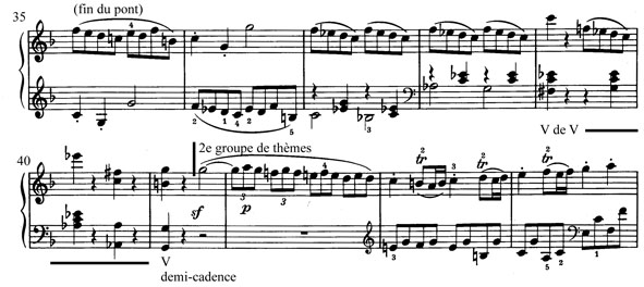 Comme mentionné précédemment, certaines sonates comportent des ponts entre les deux groupes de thèmes, certaines autres des transitions, et d’autres encore, rien du tout. Pour des exemples d’extraits musicaux, retournez quelques pages en arrière (aux pages 5 et 6, pour être plus précise) et admirez les exemples 4 à 6.
