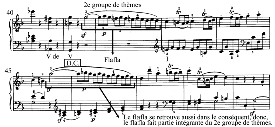 Autre constante, concernant ces demi-cadences : il est de l’habitude de Mozart de débuter le deuxième groupe de thèmes par un petit geste mélodique, parfois très court. Ce petit trait mélodique fait parfois partie du deuxième groupe de thèmes, souvent en anacrouse, parfois il n’est que décoration; par exemple, avec un deuxième groupe de thèmes qui commence par une phrase construite avec un antécédent et un conséquent, le geste mélodique fera partie du thème lorsque celui-ci sera répété dans le conséquent. Autrement, le petit trait mélodique n’est qu’ornemental, comme pour marquer l’arrivée du deuxième groupe de thèmes en caractère gras. Afin d’alléger le texte et d’éviter la confusion, appelons ce petit trait mélodique pré-deuxième-groupe-de-thèmes un « flafla ».