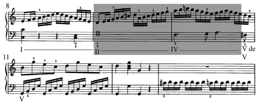 Cet exemple illustre un enchaînement de II à IV (avec un accord de passage) dans un contexte plagal (donc qui ne mène pas à V mais bien à I), dans le deuxième thème du deuxième groupe de thèmes.