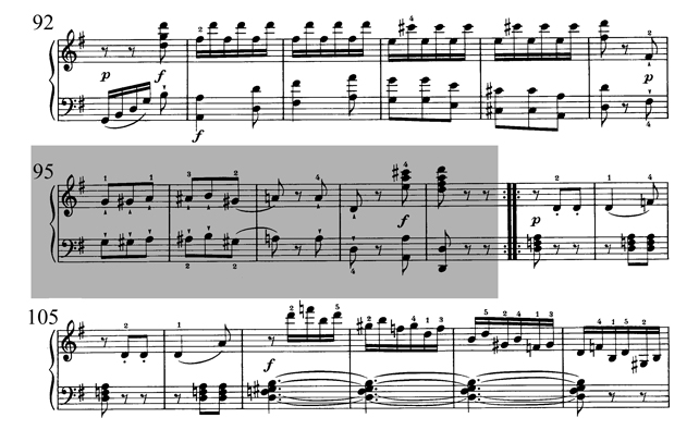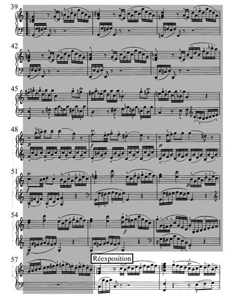 Ci-contre : exemple 03 : sonate no1, K. 279 (189d), en do majeur, troisième mouvement, mes 57-158 : la réexposition commence à la mesure 87 et se termine à la mesure 158.