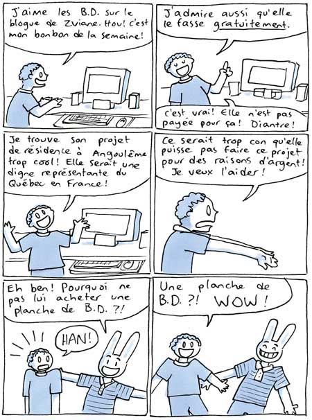 Si par miracle j'atteins cet objectif, le Zvianothon aura été un succès et je fermerai les ventes (ouais, parce que mon but, c'est pas de faire le motton avec ces planches (je doute que ce soit possible de toute façon), c'est juste de financer ma résidence!...). Autrement, le Zvianothon sera terminé le 15 janvier 2009, soit juste avant mon départ.