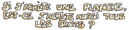 Hoooooo, certainement que non! Je conserve tous les droits sur ces planches. Ces planches, elles seront magnifiques dans une collection, affichées sur vos murs, vous pouvez aussi vous servir du dos pour écrire votre liste d'épicerie, bref, l'usage que vous en faites ne concerne que vous. Cependant, vous ne pourrez pas faire d'argent en la publiant, puisque je ne vous cède pas les droits de reproduction. De plus, si jamais les planches que vous achetez se font éditer ou rééditer, vous ne recevrez aucune redevance (et il me semble que c'est bien logique - jusqu'à ce que je sois morte, quoi. Après, ben... je vais un peu m'en foutre, parce que je serai morte).