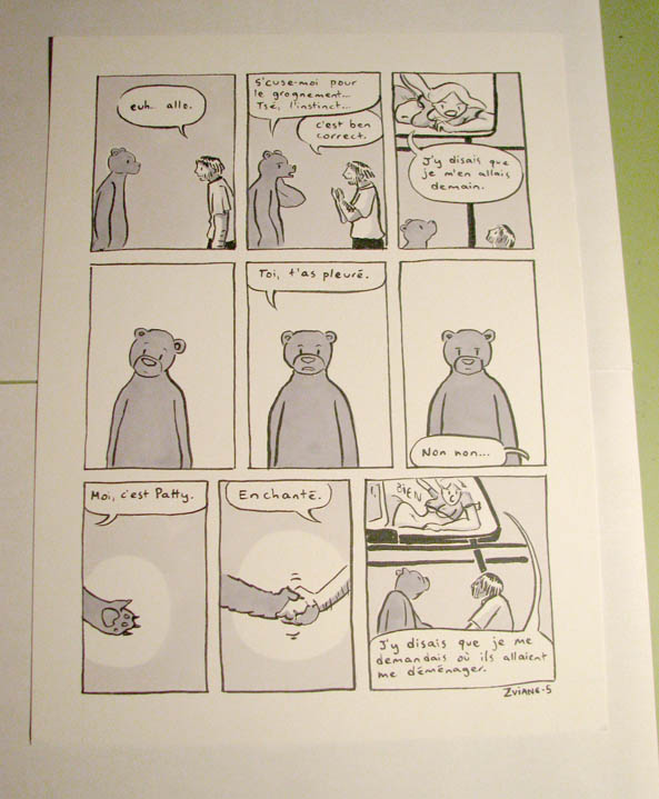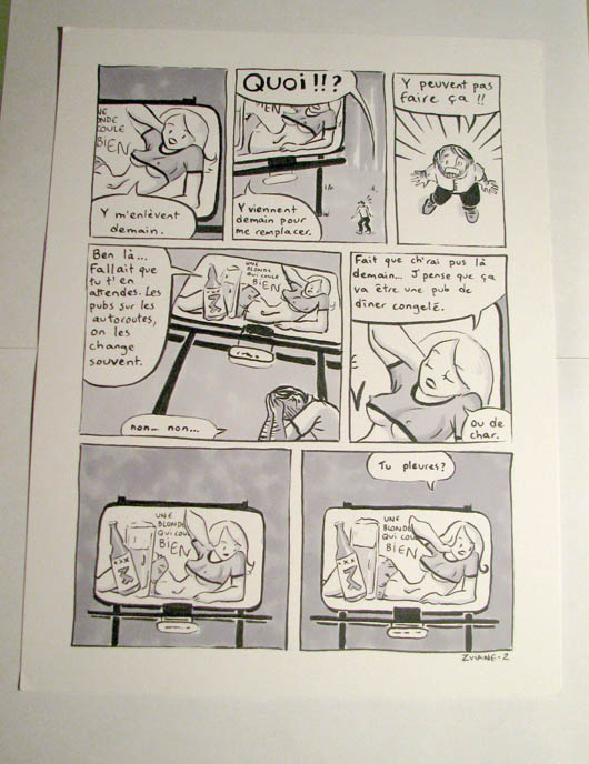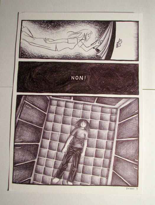 J'avais réalisé cette B.D. pour un concours de l'OFQJ pour aller à Angoulême. Il y a énormément d'amour là-dedans! Les planches ont été colorées, mais à l'ordinateur, donc les planches sont en noir et blanc. N'empêche, même sans couleur, je suis pas mal contente de ces planches.