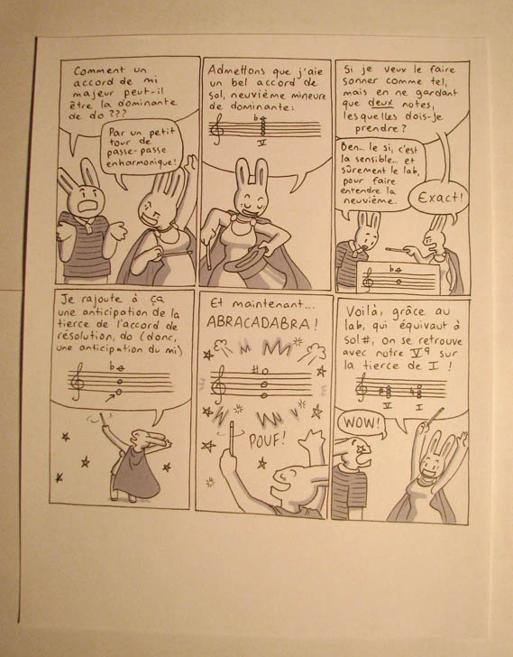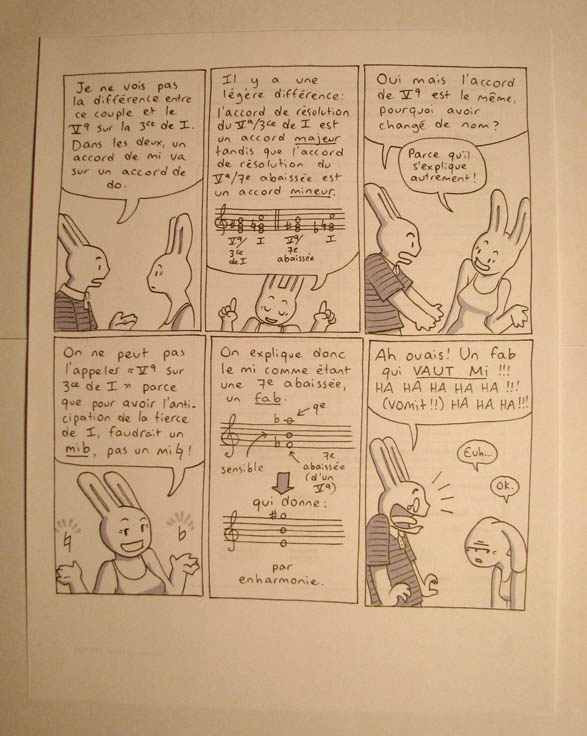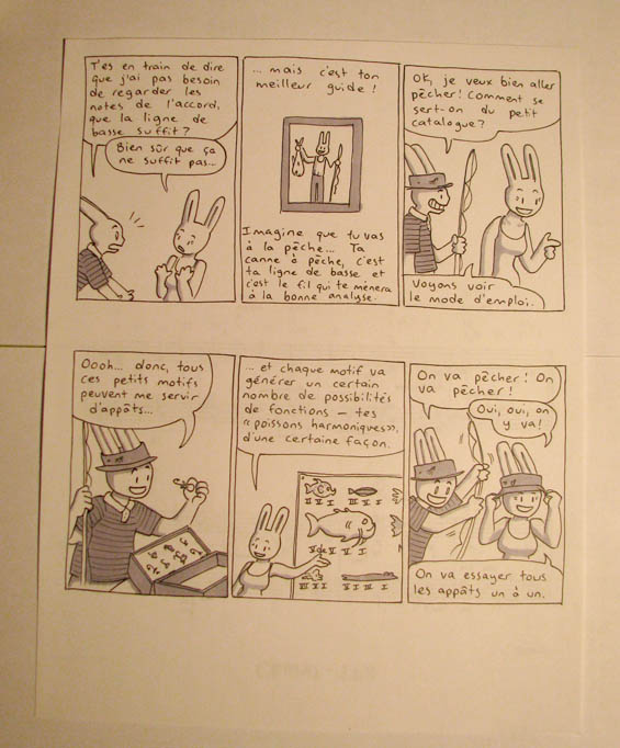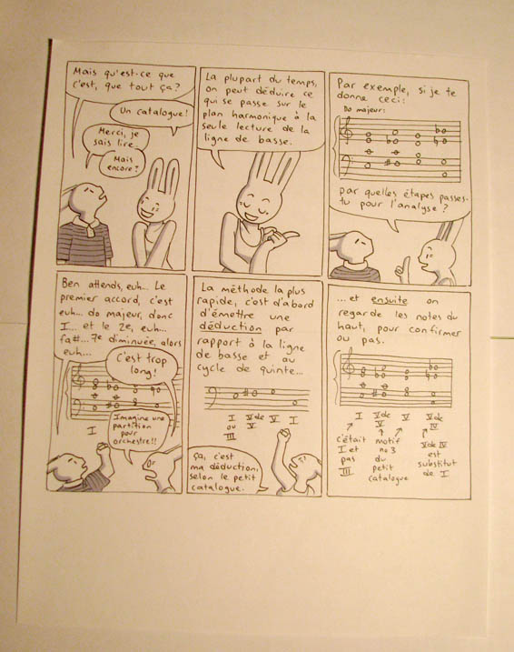 BD didactiques (de 3 à 6 cases) qui apparaissent sur le site internet de Luce Beaudet, donc, qui mettent en scène les lapins qui parlent d'analyse du discours harmonique tonal de Bach à Wagner.