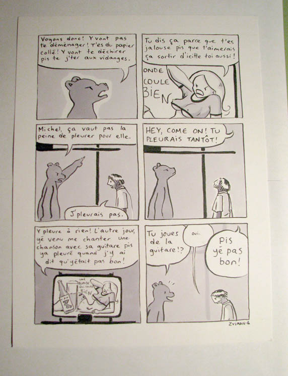 Mon premier livre, qui me valut le prix du premier concours québécois de B.D. de la librairie Monet. Le gris a été rajouté à l'ordinateur, donc les originaux sont en noir et blanc.
