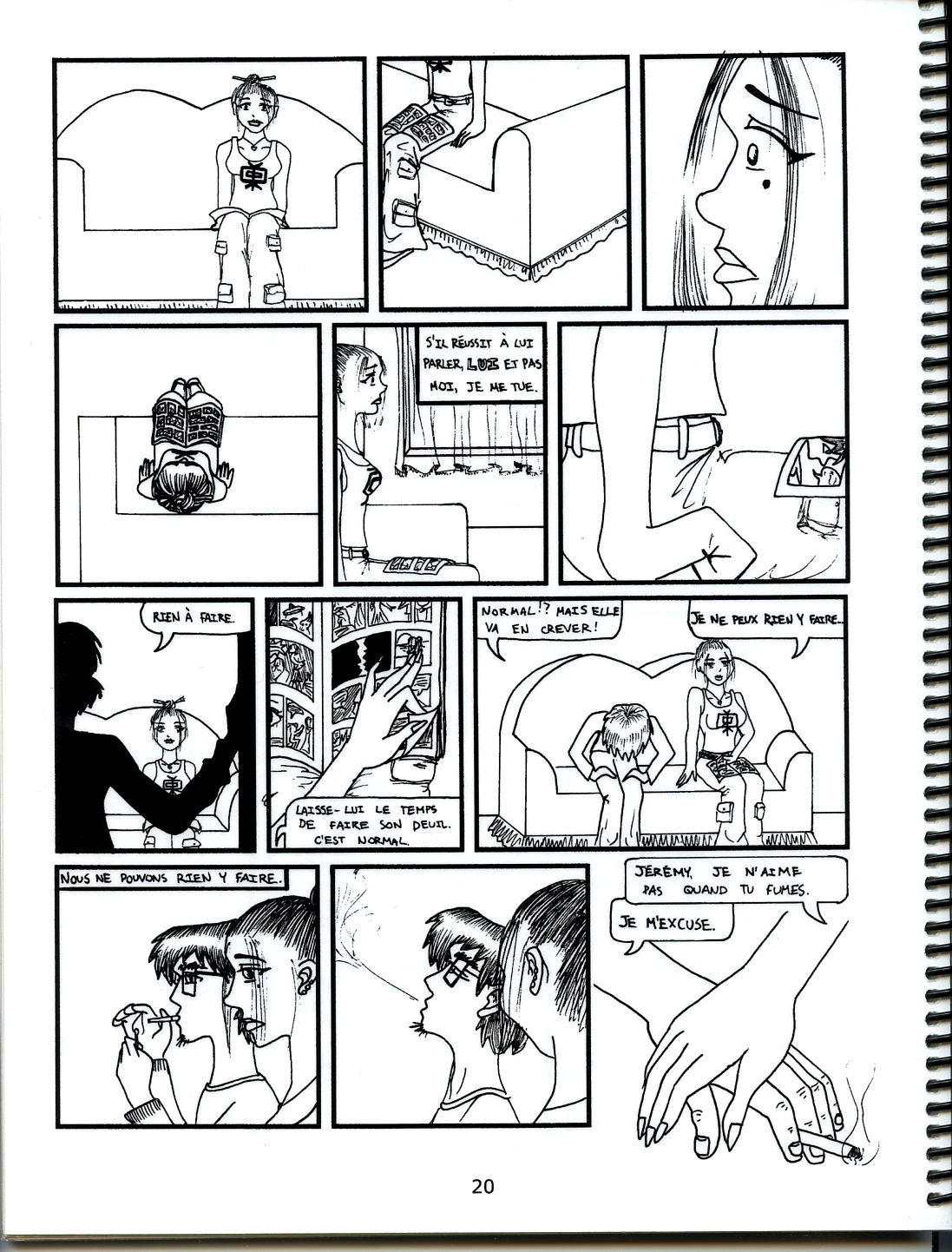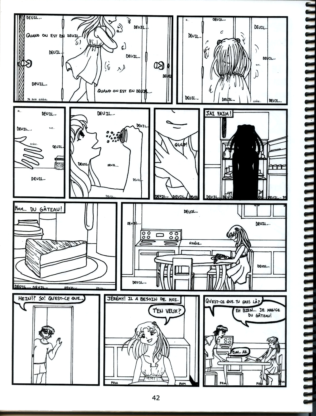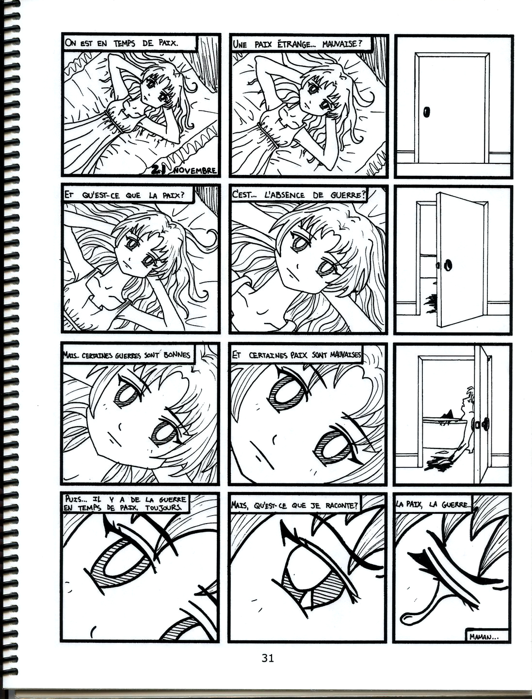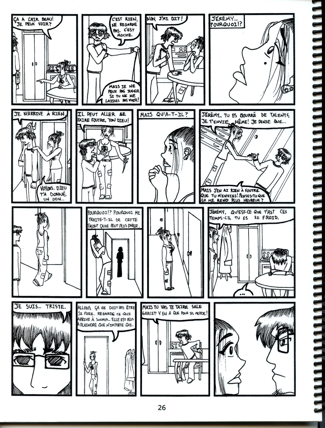 C'était mon projet personnel de secondaire 5. La BD fait 39 pages, plus les deux couves (j'ai omis de mettre certaines page blanches, c'est pour ça que la pagination saute).