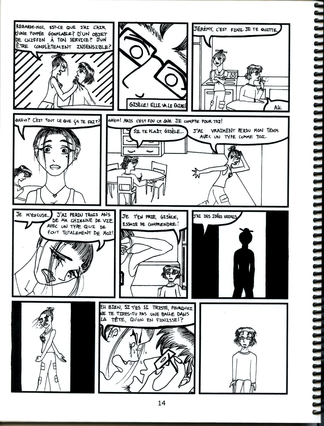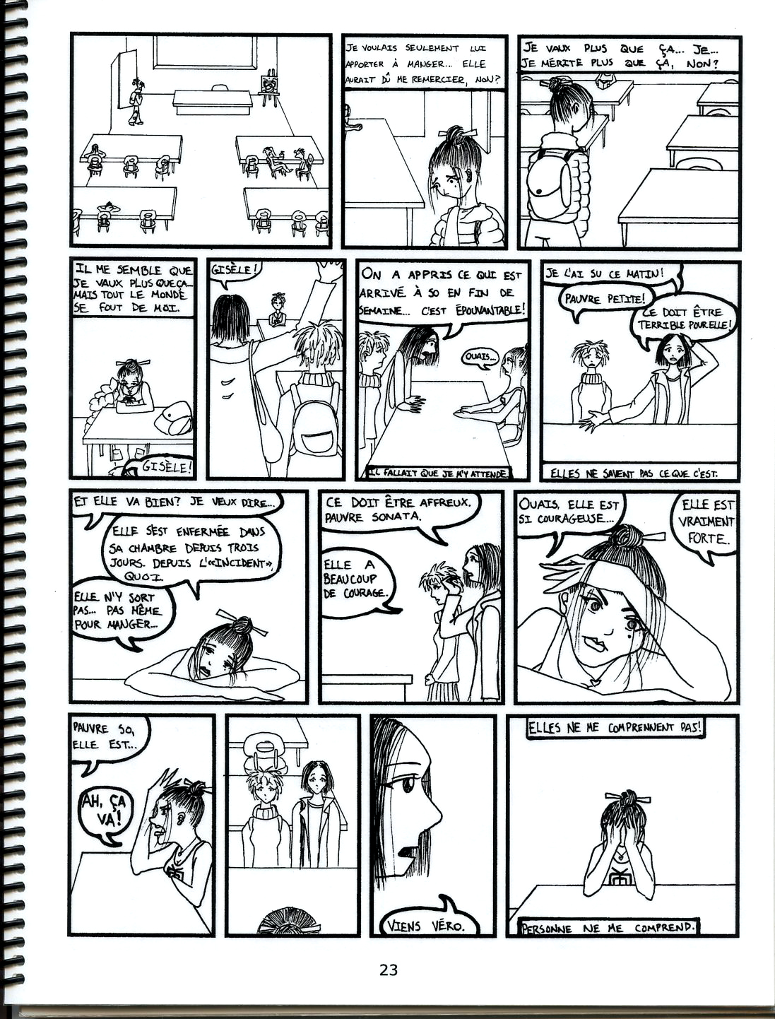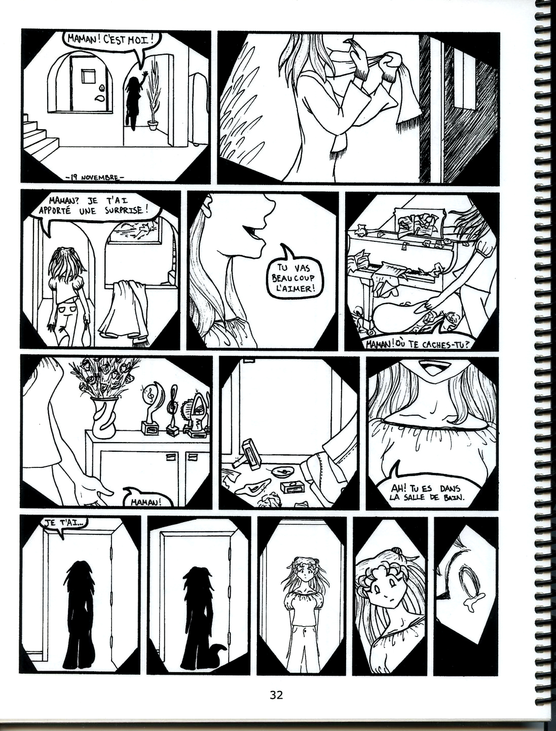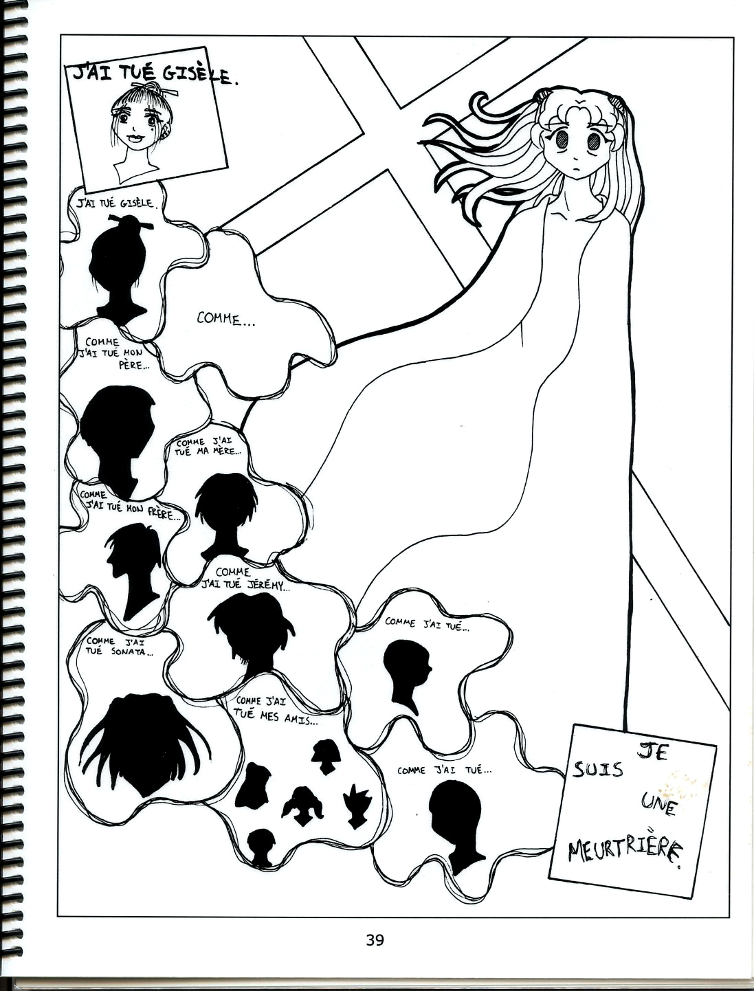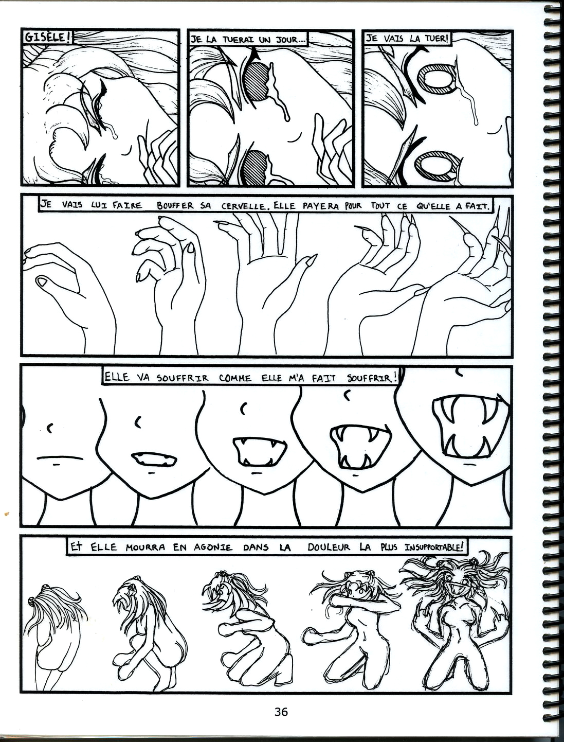C'était mon projet personnel de secondaire 5. La BD fait 39 pages, plus les deux couves (j'ai omis de mettre certaines page blanches, c'est pour ça que la pagination saute).