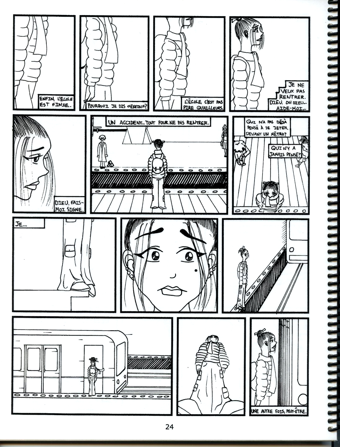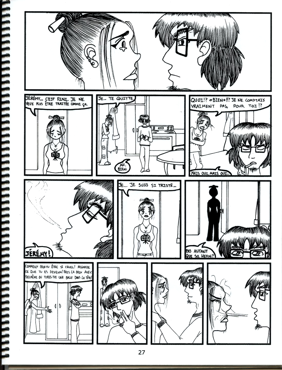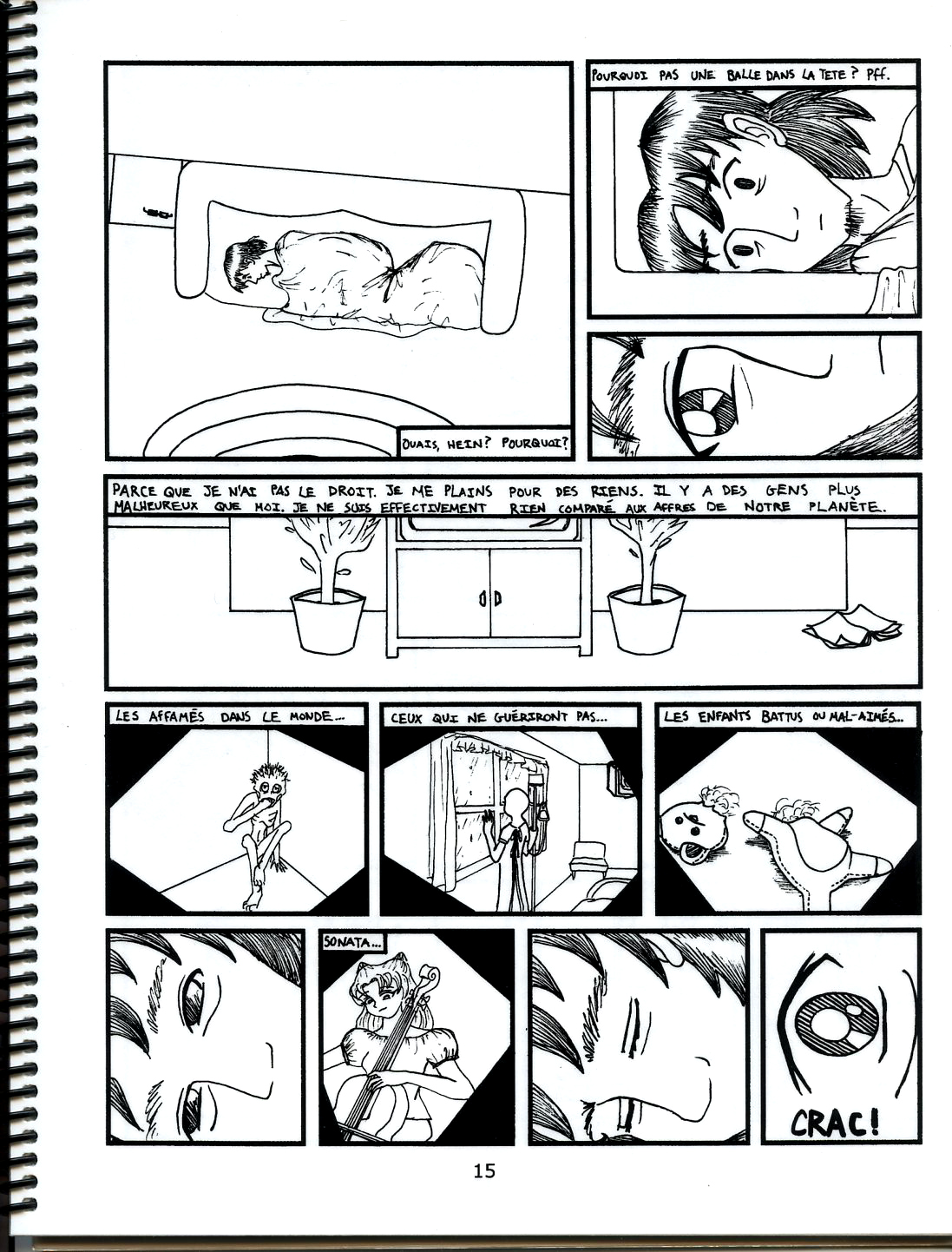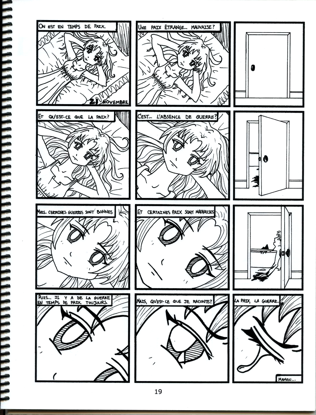 C'était mon projet personnel de secondaire 5. La BD fait 39 pages, plus les deux couves (j'ai omis de mettre certaines page blanches, c'est pour ça que la pagination saute).