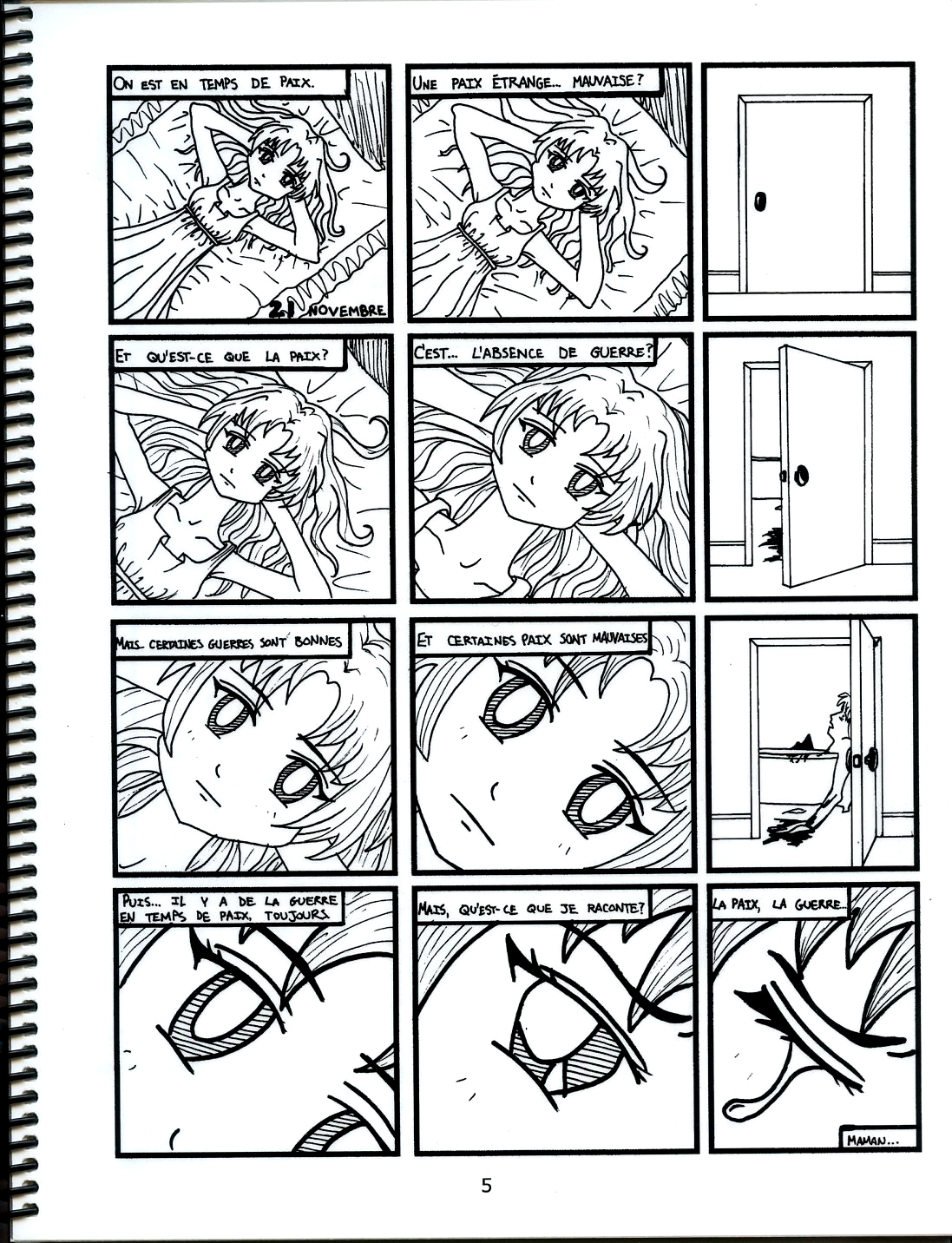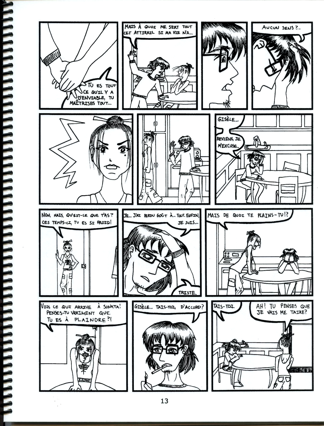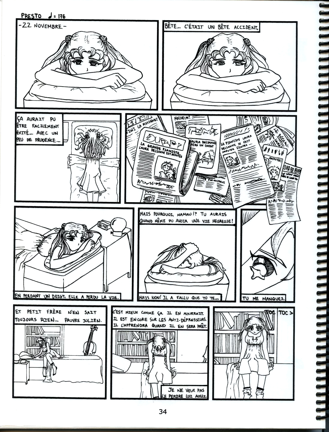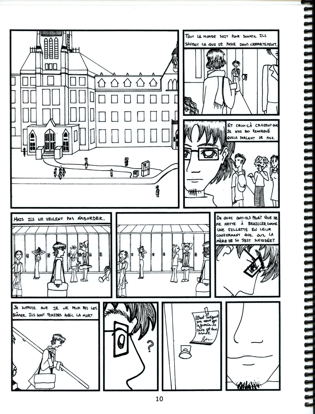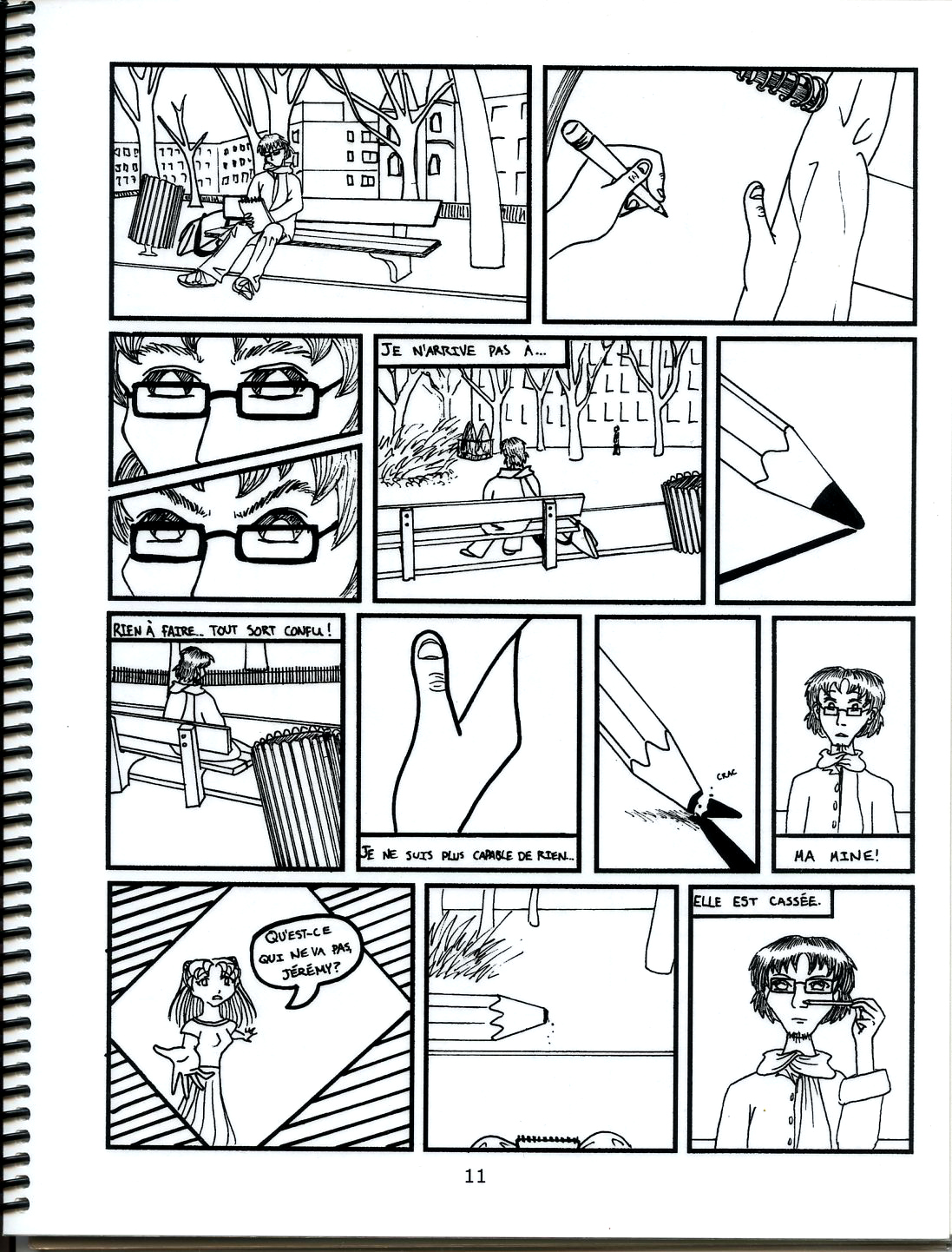 C'était mon projet personnel de secondaire 5. La BD fait 39 pages, plus les deux couves (j'ai omis de mettre certaines page blanches, c'est pour ça que la pagination saute).