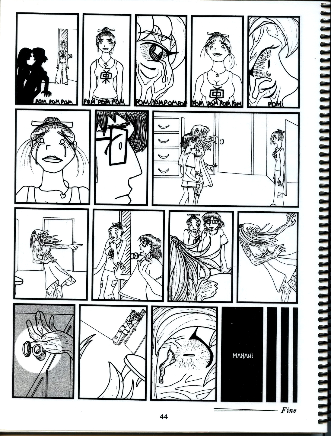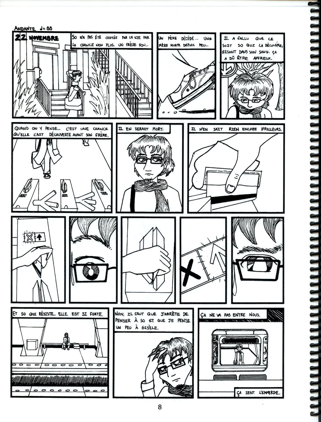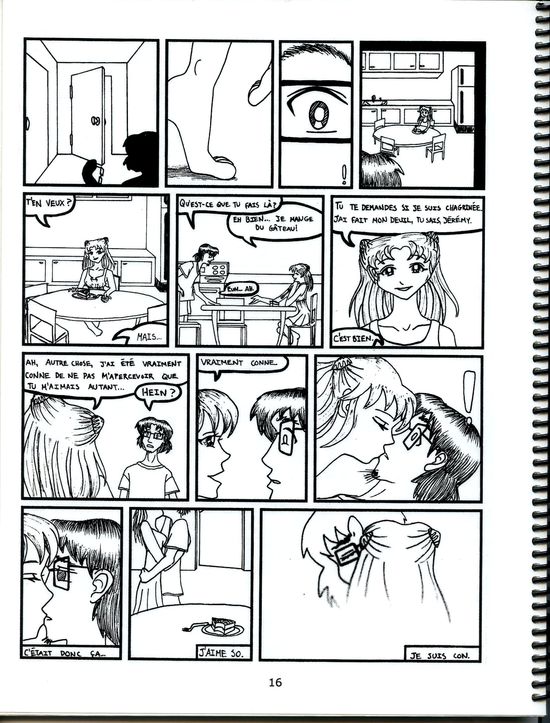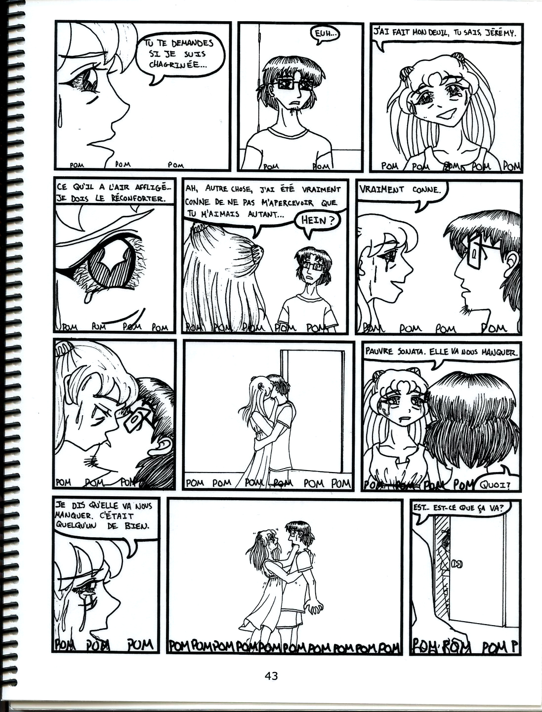 C'était mon projet personnel de secondaire 5. La BD fait 39 pages, plus les deux couves (j'ai omis de mettre certaines page blanches, c'est pour ça que la pagination saute).