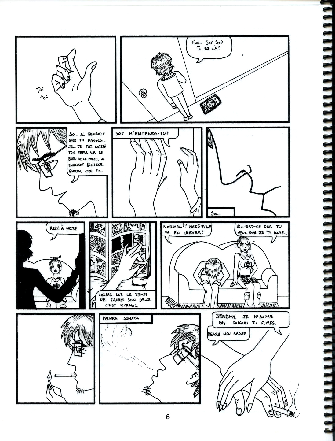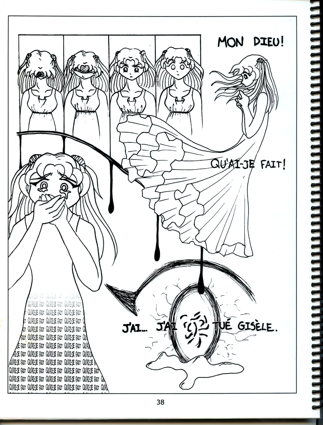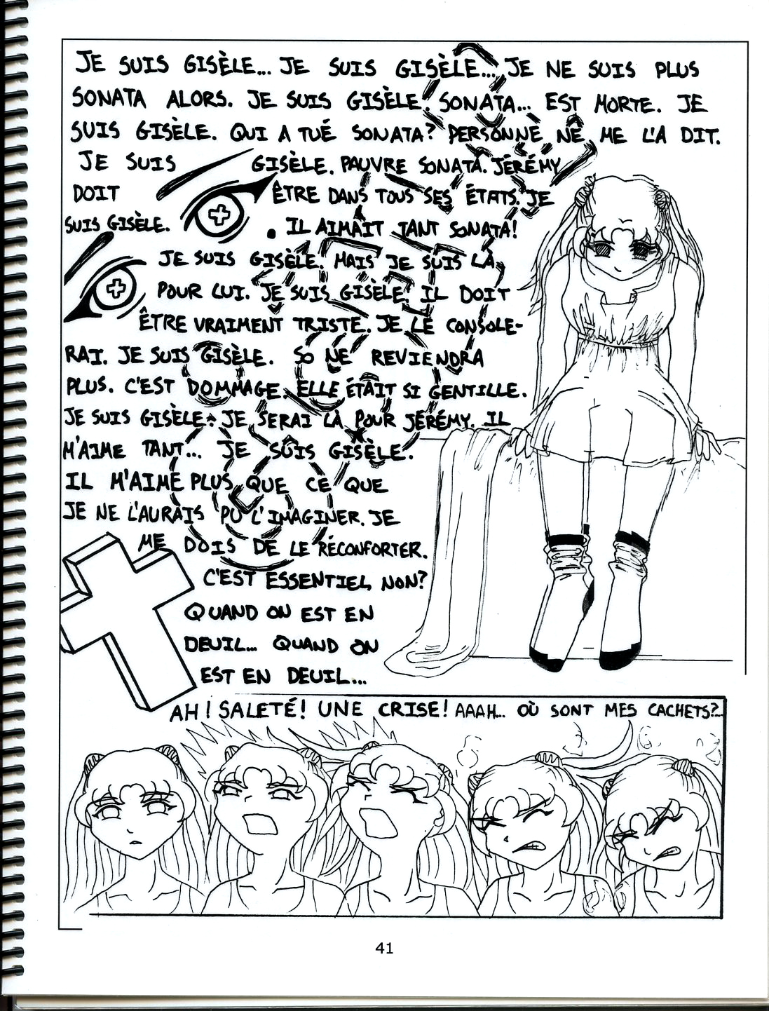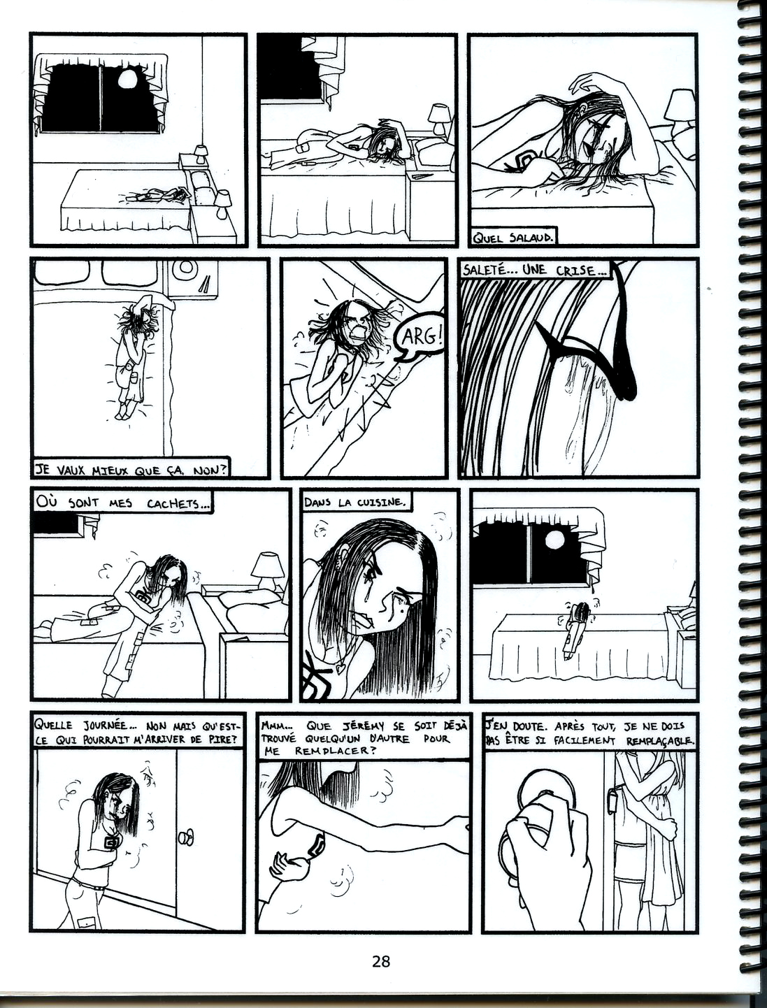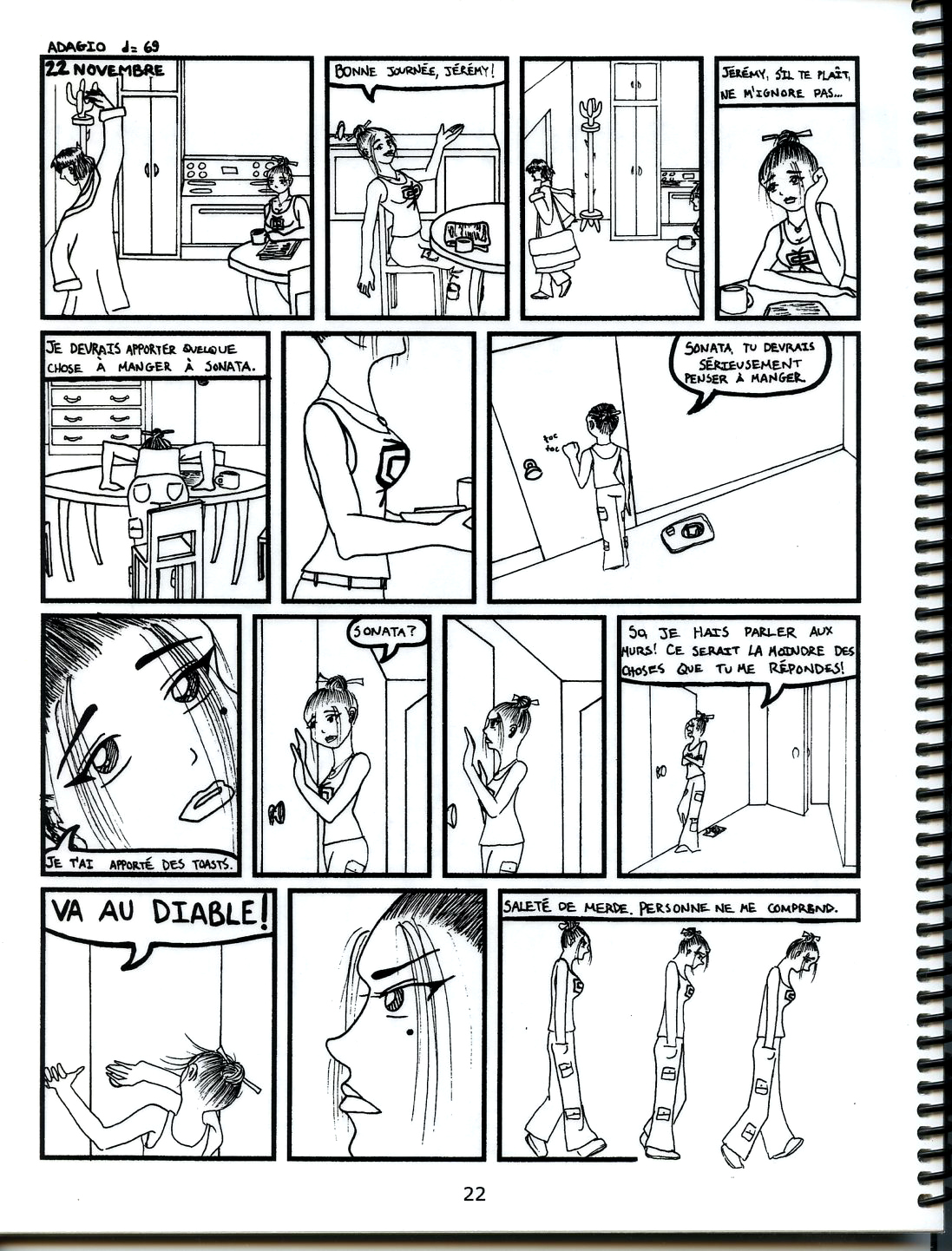 C'était mon projet personnel de secondaire 5. La BD fait 39 pages, plus les deux couves (j'ai omis de mettre certaines page blanches, c'est pour ça que la pagination saute).