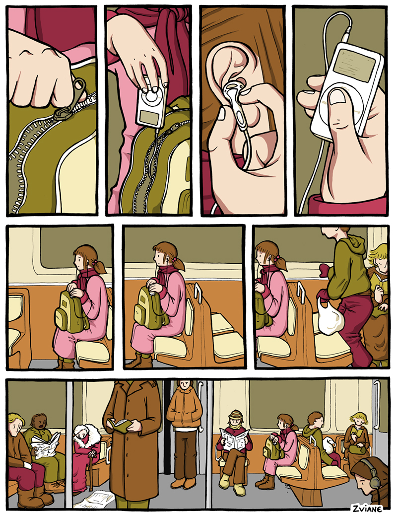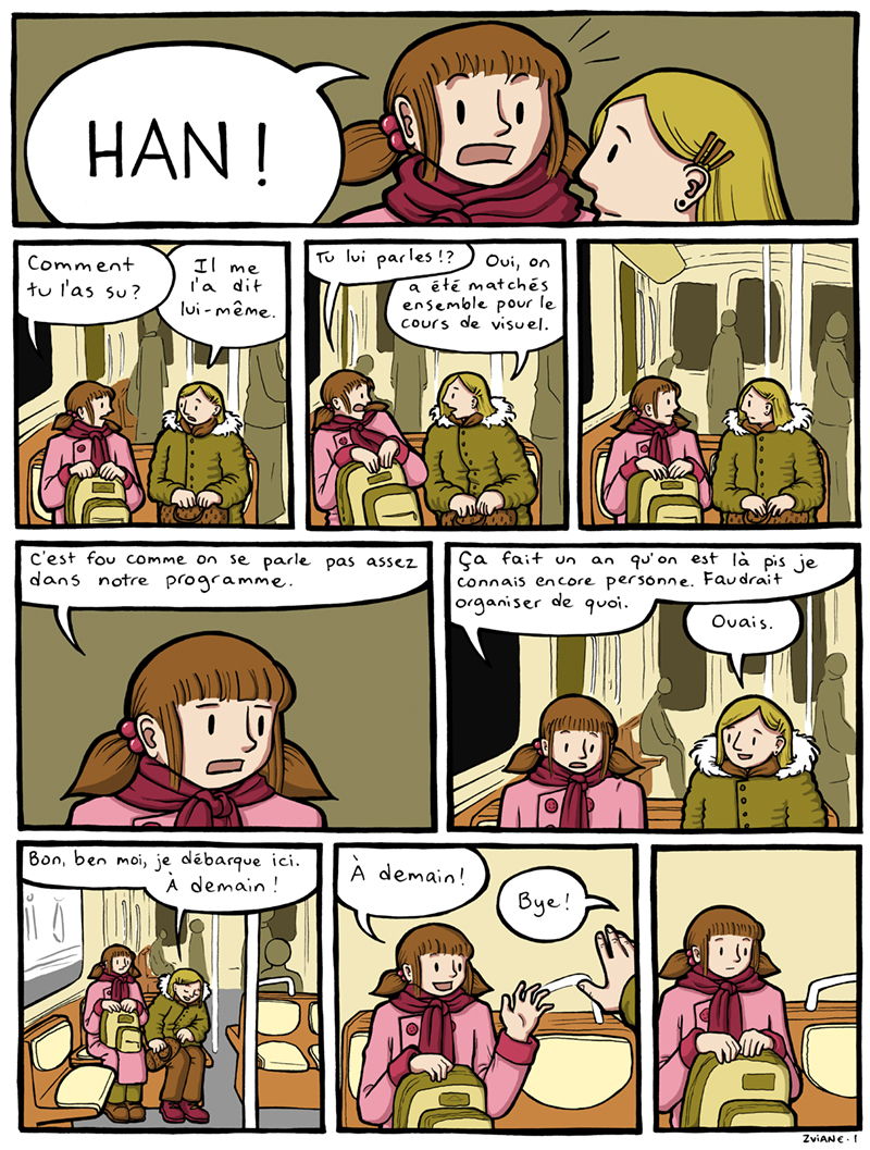 Dessiné pour un concours de BD (dirigé par Thomas-Louis Côté, il me semble) dont le thème était "Regard sur la ville", puis peut-être publié par la suite en tons de gris dans le Vestibulles? je m'en rappelle plus... En tout cas j'ai pas gagné.