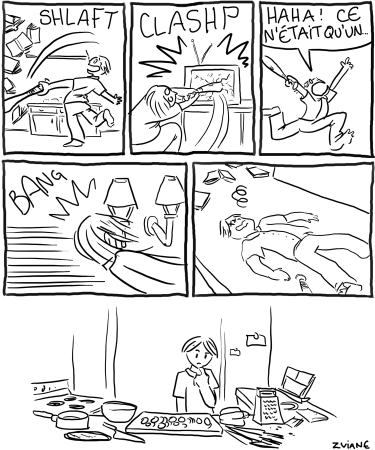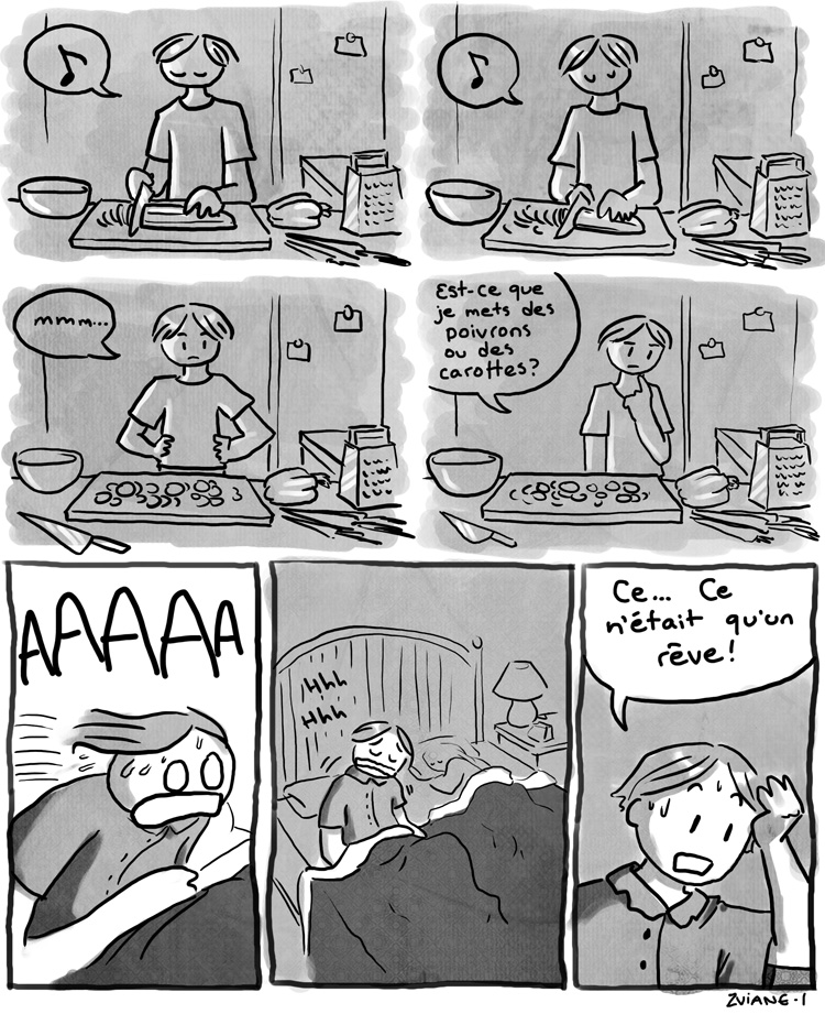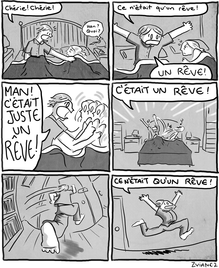 Paru dans la revue Vestibulles. Pour narguer Jimmy qui nous avait dit: svp faites pas une BD "ce n'était qu'un rêve". (il me semble que toute la BD était dans des tons de gris? c'est passé où???)